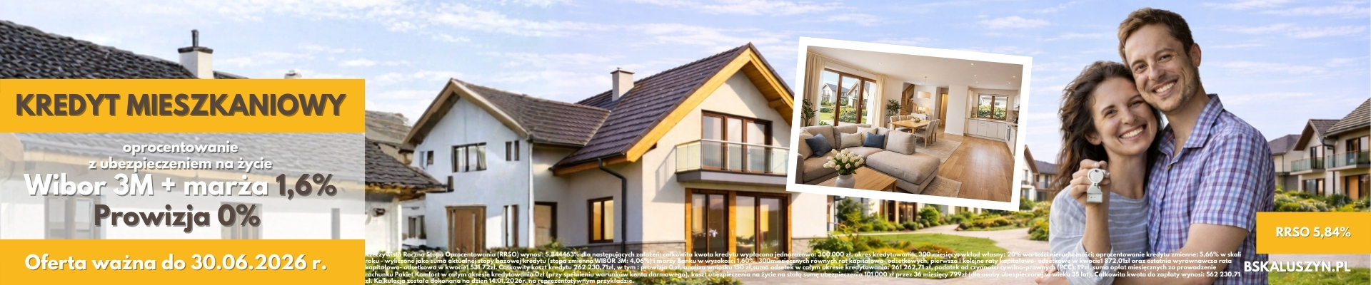 Rzeczywista Roczna Stopa Oprocentowania (RRSO) wynosi: 5,844463% dla następujących założeń: całkowita kwota kredytu wypłacona jednorazowo: 300 000 zł, okres kredytowania: 300 miesięcy; wkład własny: 20% wartości nieruchomości; oprocentowanie kredytu zmienne: 5,66% w skali roku - wyliczone jako suma aktualnej stopy bazowej kredytu (stopa zmienna WIBOR 3M: 4,06%) i marży Banku w wysokości 1,60%, 300miesięcznych równych rat kapitałowo- odsetkowych, pierwsza i kolejne raty kapitałowo- odsetkowe w kwocie1 872,01zł oraz ostatnia wyrównawcza rata kapitałowo- odsetkowa w kwocie1 531,72zł. Całkowity koszt kredytu 262 230,71zł, w tym : prowizja 0 zł, analiza wniosku 150 zł,suma odsetek w całym okresie kredytowania: 261 262,71 zł, podatek od czynności cywilno-prawnych (PCC): 19zł, suma opłat miesięcznych za prowadzenie rachunku Pakiet Komfort w całym okresie kredytowania 0zł (przy spełnieniu warunków konta darmowego), koszt ubezpieczenia na życie na stałą sumę ubezpieczenia 101 000 zł przez 36 miesięcy 799zł (dla osoby ubezpieczonej w wieku 35 lat).W całkowitym koszcie kredytu Bank nie uwzględnia następujących kosztów: kosztu wyceny nieruchomości, gdyż nie jest dostawcą tej usługi dodatkowej dla konsumenta. Całkowita kwota do zapłaty wynosi: 562 230,71 zł. Oprocentowanie kredytu jest zmienne i w okresie obowiązywania umowy kredytu może ulec zmianie w związku ze zmianą stopy referencyjnej WIBOR 3M, która może spowodować, że koszty obsługi kredytu mogą wzrosnąć lub zmaleć. Zmienne oprocentowanie niesie za sobą ryzyko wzrostu wysokości raty, a tym samym całkowitej kwoty do zapłaty. Kalkulacja została dokonana na dzień 14.01.2026r. na reprezentatywnym przykładzie.