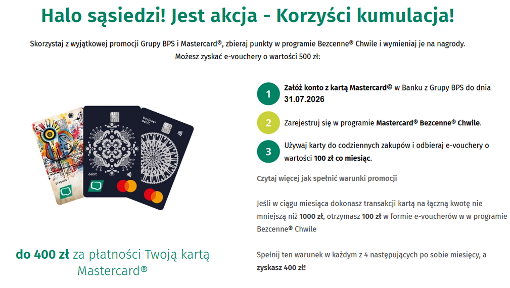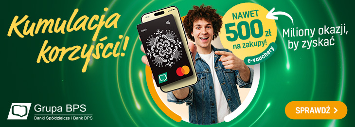 Promocja „Kumulacja korzyści. Edycja 3” obowiązuje w wybranych Bankach z Grupy BPS w terminie 7.01.2026 – 31.07.2026 r. lub do wyczerpania puli nagród i kierowana jest do uczestników Mastercard Bezcenne Chwile („Program”), którzy zarejestrowali w Programie swoją kartę oraz dokonali w określonym czasie transakcji na co najmniej 1000 zł. Nagrody wydawane są w postaci punktów (nawet 40 000 punktów), wymienialnych na nagrody przypisane dla wartości tych punktów w katalogu nagród (w tym na e-vouchery) w Programie. Pula Nagród wynosi 5 000. Szczegóły w regulaminie na stronie www.mojbank.pl/kumulacja-korzysci. Karty wyłączone z promocji zostały wskazane w regulaminie. Organizatorem promocji jest Mastercard Europe SA, działający w Polsce poprzez Mastercard Europe SA Oddział w Polsce.